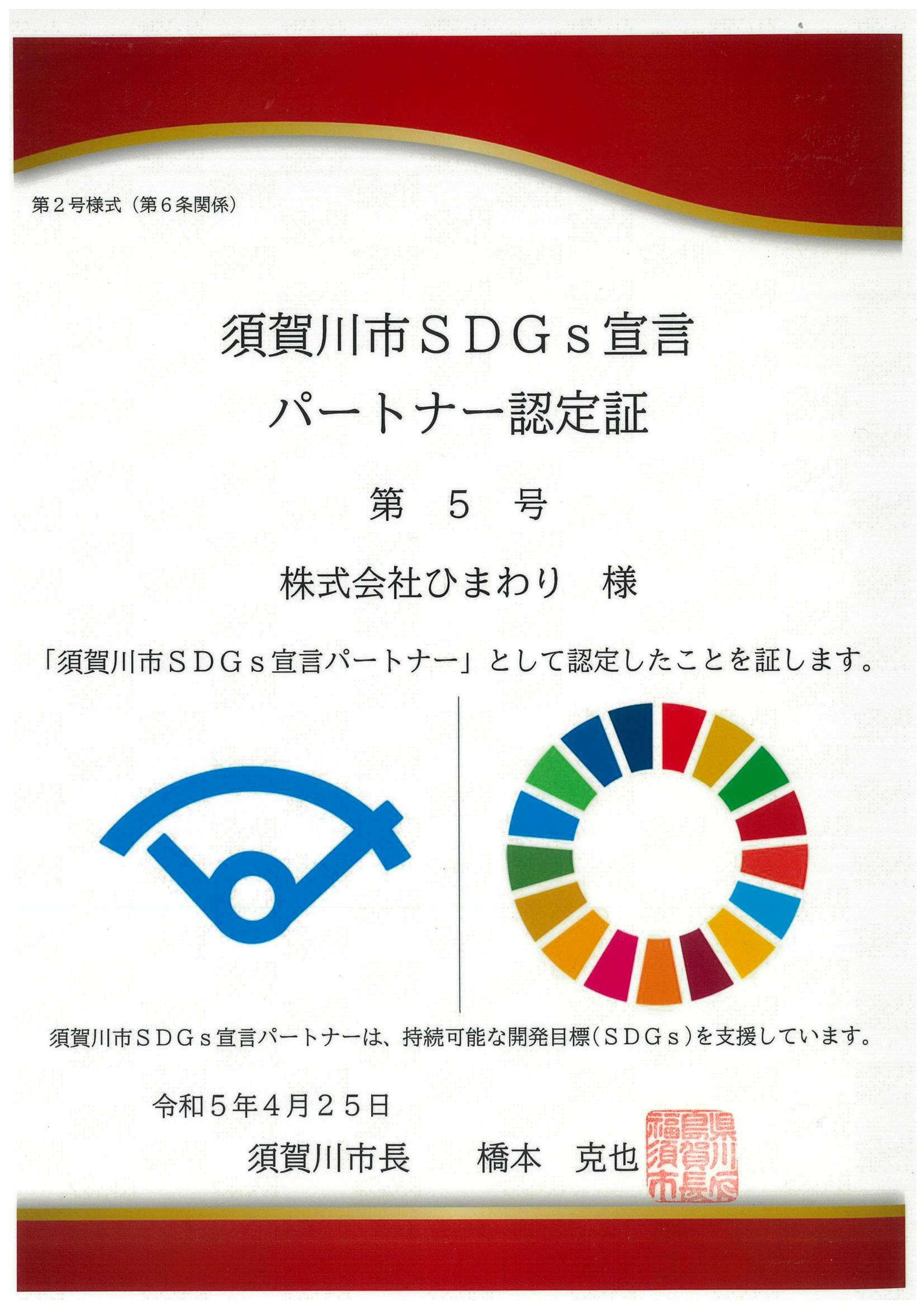 須賀川市へ宣言書を提出し、須賀川市のSDGs宣言パートナーへの認定をいただきました。