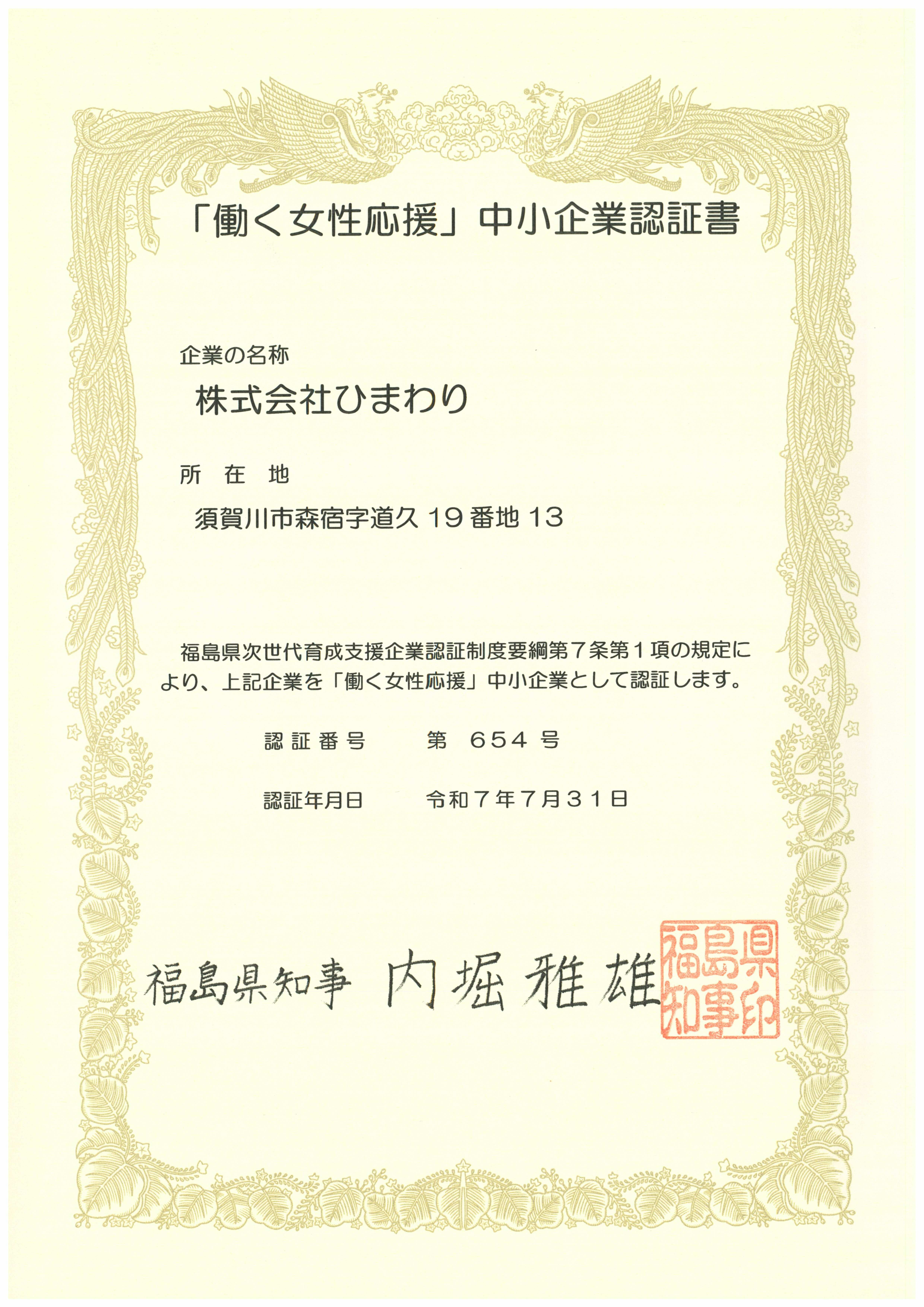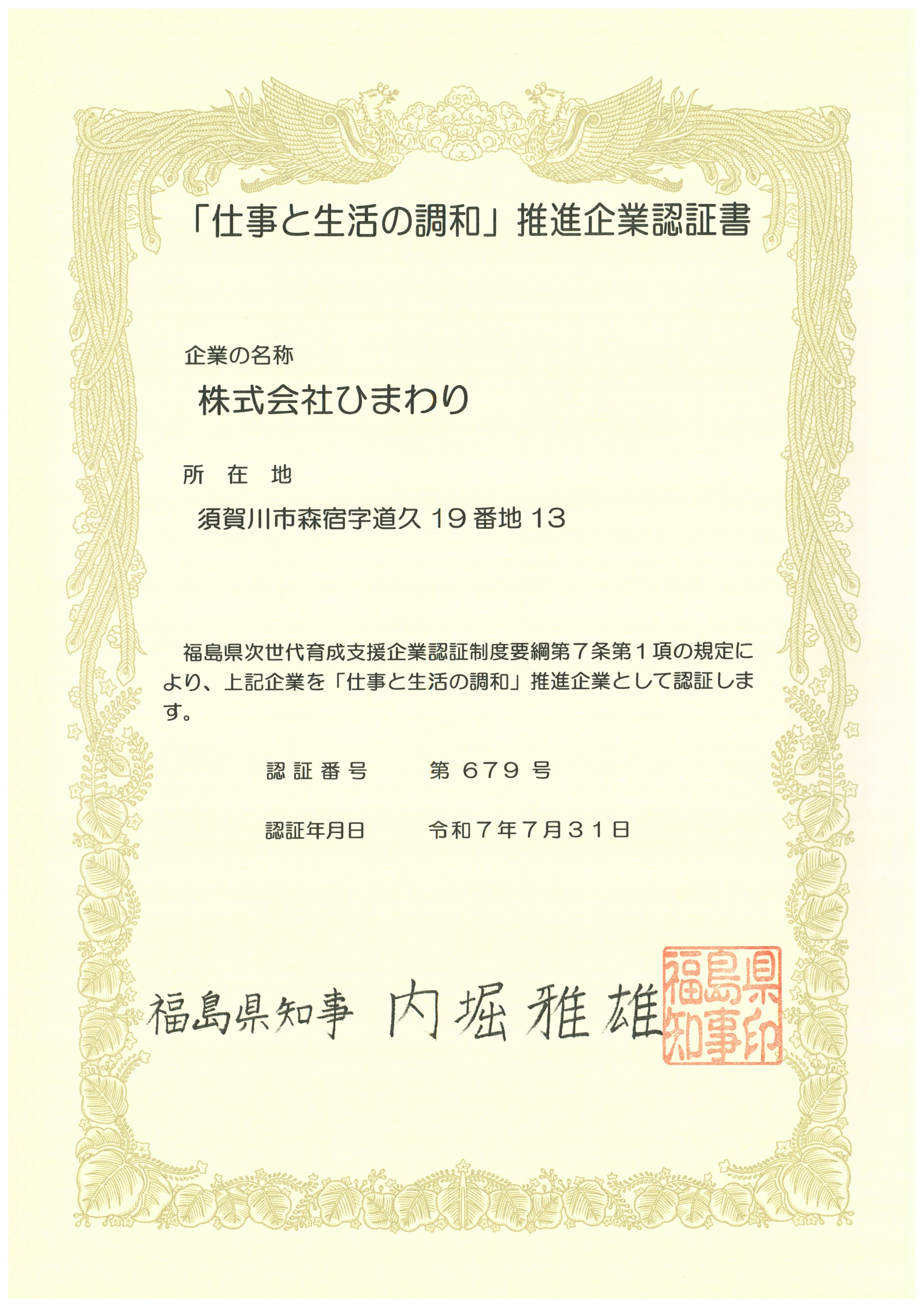 この度、弊社は福島県次世代育成支援企業認証について「働く女性応援」中小企業及び「仕事と生活の調和」推進企業として認証を頂きました。令和7年9月25日、県中振興局にて認証書交付式に出席し、認証書を頂いて参りました。今後とも、より良い職場環境づくりに邁進していきたいと思います。